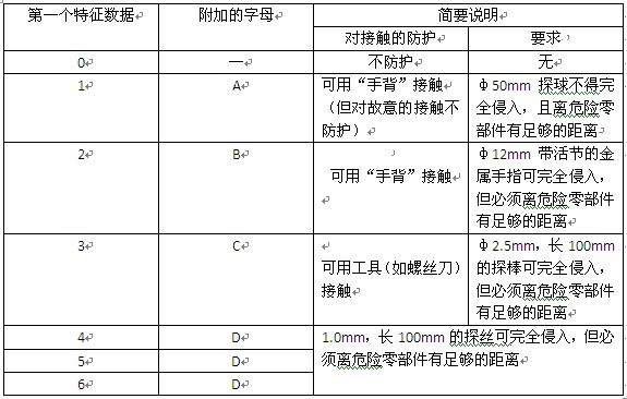備注:接觸防護的級別比通過第1個特征數據所標注的要高,或者只應該標注接觸防護的級別(第一個特征數據通過X來代替)。通過對接觸防護,只標注一個防護級別,可以將有關的更低的防護級別包括進去。